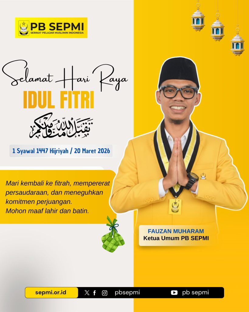Dalam rangka menyambut Hari Raya Idul Fitri 1447 Hijriah, Pengurus Besar Serikat Pelajar Muslimin Indonesia (PB SEPMI) menyampaikan ucapan selamat kepada seluruh umat Islam di Indonesia.