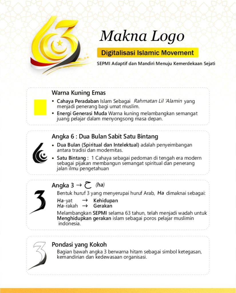 - Angka 3→ごh) Bentuk huruf 3 yang menyerupai huruf Arab, Ha dimaknai sebagai: Ha-yat Kehidupan Ha- rakah: Gerakan Melambangkan SEPMI selama 63 tahun, telah menjadi wadah untuk Menghidupkan gerakan islam sebagai poros pelajar muslimin indonesia.